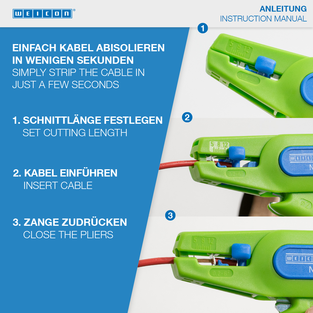 Das Arbeiten mit WEICON Abisolierwerkzeugen ist nur an potentialfreien, nicht unter Spannung stehenden Kabeln und Leitungen zulässig.