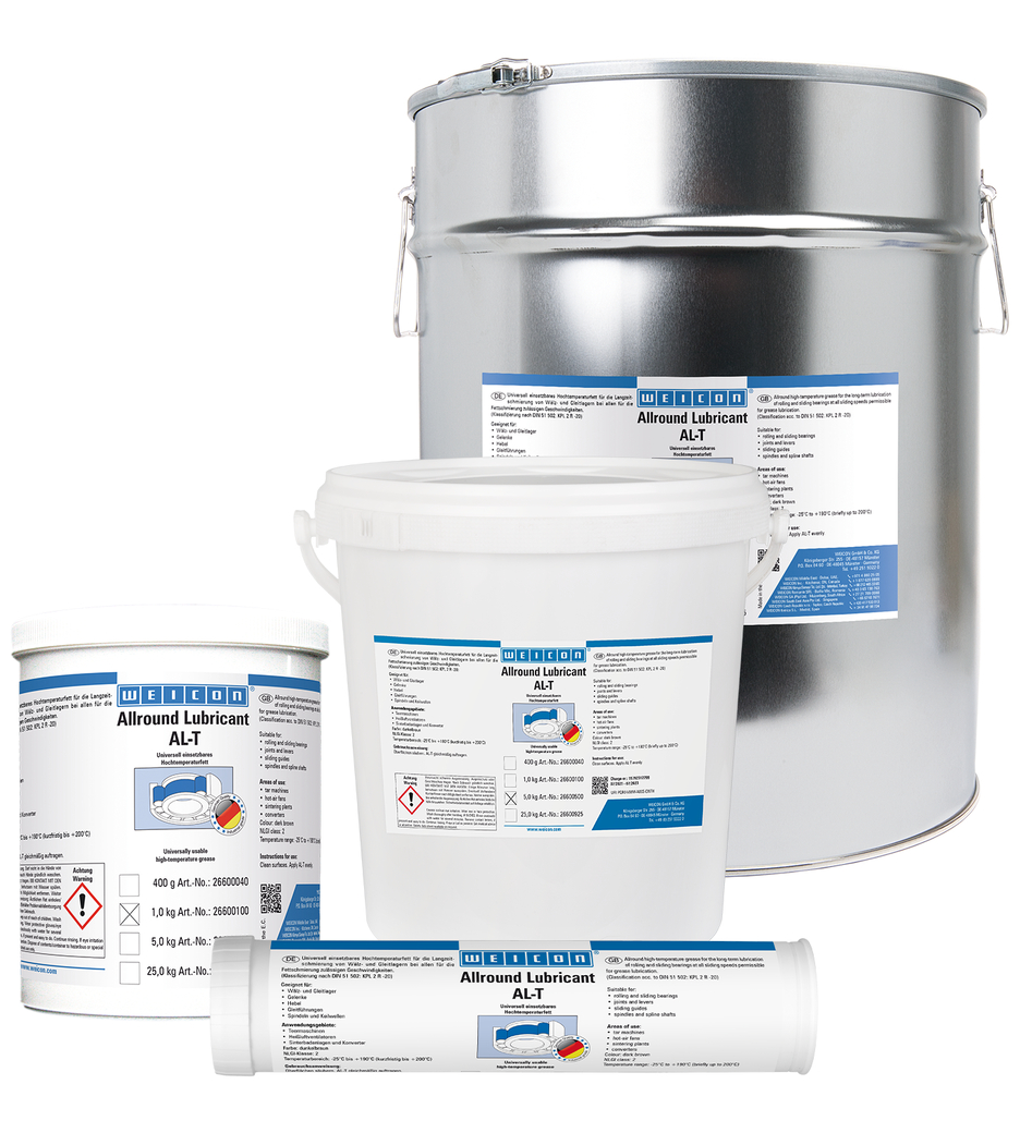 WEICON AL-T eignet sich für Wälz- und Gleitlager, Gelenke, Hebel, Gleitführungen, Spindeln, Keilwellen und bei allen für die Fettschmierung zulässigen Gleitgeschwindigkeiten. AL-T kann in vielen Bereichen der Industrie eingesetzt werden.