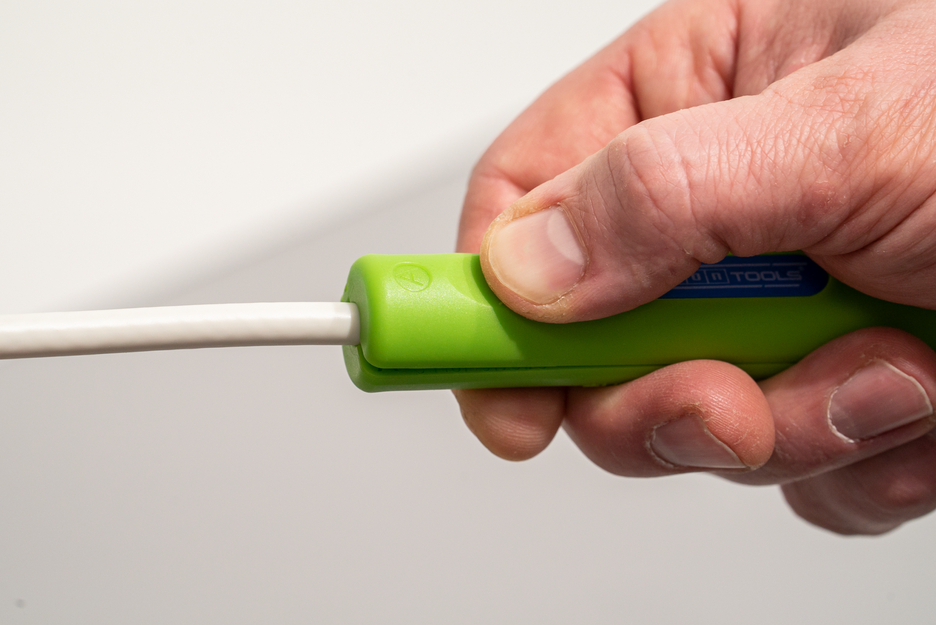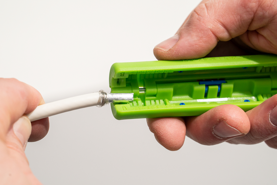 Mit der Green Line wurde eine ganz spezielle Werkzeugreihe entwickelt. Die Werkzeuge bestehen aus bis zu 97 % nachwachsenden Rohstoffen, sind recyclebar und verfügen über eine exzellente Ökobilanz. Der Coax-Stripper No. 2 ermöglicht ein stufenweises Abisolieren aller gängigen Koaxialkabel, NYM-Kabel und flexiblen Kabel. Eine Einstellung der Schnitttiefe ist nicht erforderlich. Der Coax-Stripper No. 2 entmantelt Koaxialkabel mit einem Durchmesser von 4,8 – 7,5 mm, NYM-Kabel von 3 x 0,75 mm² und flexible Kabel von 10 und 16 mm². Beim Einsatz des Entmantelers zeigt sich beim Abisolieren ein präzises Schnittbild. Mit dem Messer des Entmantelers auf Seite A kann beispielsweise der erste Mantel eines Koaxialkabels entfernt werden. Anschließend wird mit der Seite B der innere Leiter entmantelt....