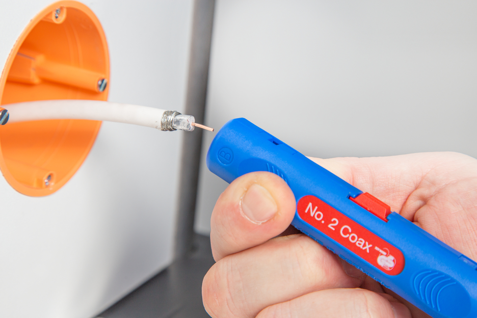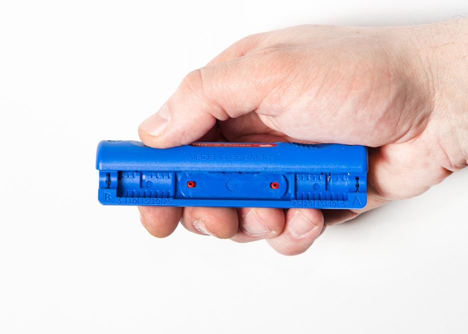 Der Coax-Stripper No. 2 ermöglicht ein stufenweises Abisolieren aller gängigen Koaxialkabel, NYM-Kabel und flexiblen Kabel. Eine Einstellung der Schnitttiefe ist nicht erforderlich. Der Coax-Stripper No. 2 entmantelt Koaxialkabel mit einem Durchmesser von 4,8 – 7,5 mm, NYM-Kabel von 3 x 0,75 mm² und flexible Kabel von 10 und 16 mm². Beim Einsatz des Entmantelers zeigt sich beim Abisolieren ein präzises Schnittbild. Mit dem Messer des Entmantelers auf Seite A kann beispielsweise der erste Mantel eines Koaxialkabels entfernt werden. Anschließend wird mit der Seite B der innere Leiter entmantelt.