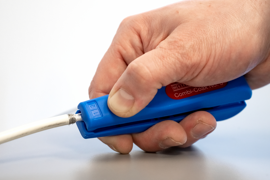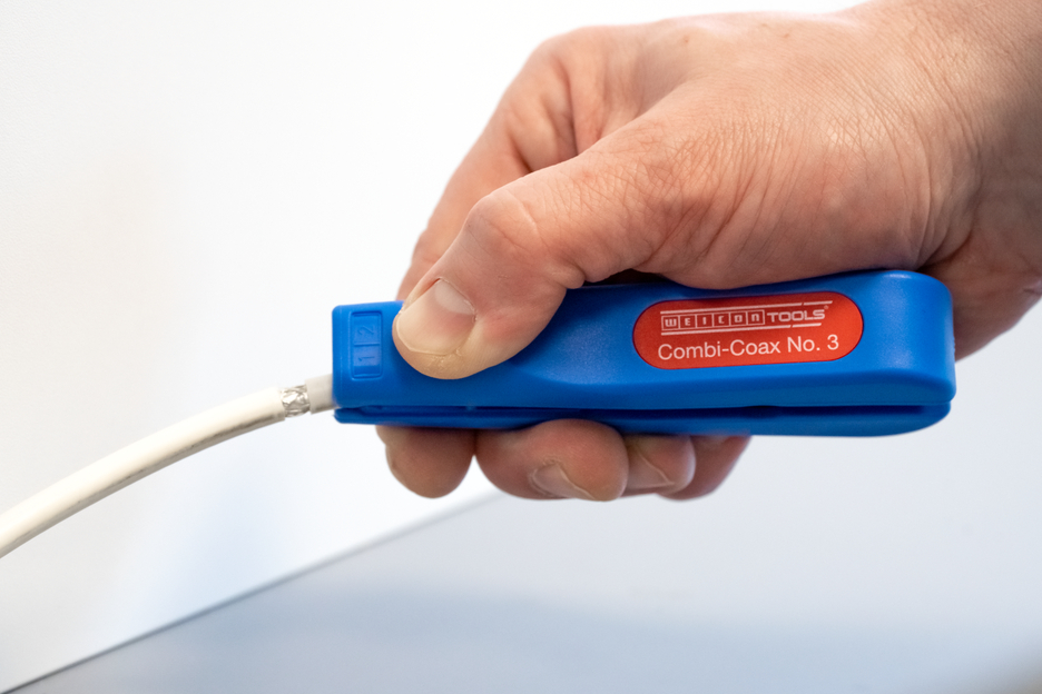 Der Combi-Coax No. 3 ermöglicht ein stufenweises Abisolieren aller gängigen Coaxialkabel, NYM-Kabel und flexiblen Kabel. Eine Einstellung der Schnitttiefe ist nicht erforderlich. Der Combi-Coax No. 3 entmantelt Coaxial-Kabel mit einem Durchmesser von 4,8 – 7,5 mm, NYM-Kabel von 3 x 0,75 mm² und flexible-Kabel von 10 und 16 mm². Zusätzlich verfügt der Combi-Coax No. 3 über einen gut zugänglichen Seitenschneider für Kabel bis 8 mm Durchmesser. Beim Einsatz des Entmantlers zeigt sich beim Abisolieren ein präzises Schnittbild. Mit dem Messer des Entmantlers auf Seite A kann beispielsweise der erste Mantel eines Coaxialkabels entfernt werden. Anschließend wird mit der Seite B der innere Leiter entmantelt.