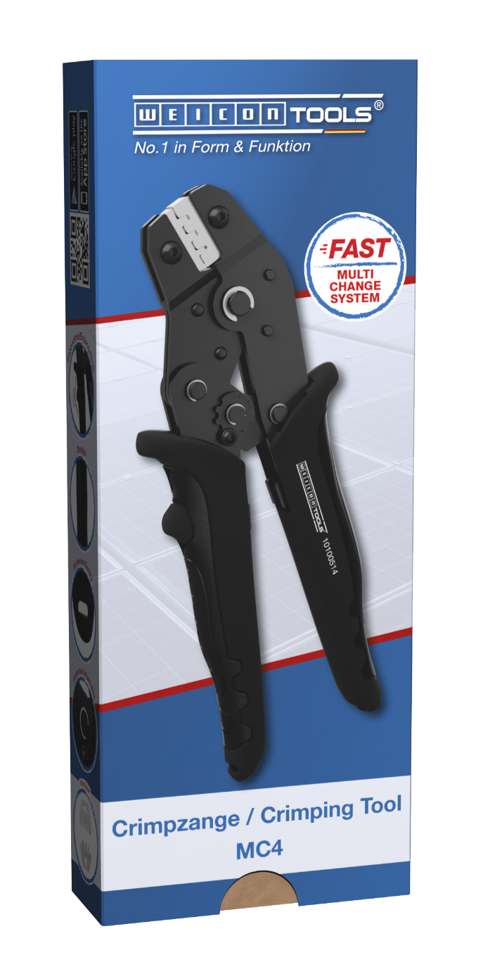Die Crimpzange MC4 wurde speziell für das prozesssichere Crimpen von MC4-Stecker an PV-Anlagen entwickelt. Die Zange besitzt einen Ratschen-Mechanismus mit Zwangssperre für gleichbleibend hohe Crimpqualität und wiederholgenaues Arbeiten. Der Mechanismus öffnet die Zange erst dann, wenn der Crimpprozess vollständig abgeschlossen ist. Zusätzlich wurde im Griff eine Notentriegelung integriert, die die Zange im Fall einer Fehlanwendung wieder öffnet. Mit der präzisen Exentereinstellung der Zange kann die Crimpkraft exakt justiert werden. Dieses Feature sorgt für eine durchgehend hohe Crimpqualität. Mit dem Multi Change System können die Crimpmodule der Zange schnell ausgetauscht werden. Der werkzeuglose und unkomplizierte Wechselprozess sorgt für einen schnellen Ein- und Ausbau der Module. In der Standardausführung wird die Crimpzange MC4 mit einem Modul aus hochwertigem Stahl für MC4-Stecker mit Kabelquerschnitten von 2,5 mm², 4 mm² und 6 mm² (14-10 AWG) ausgeliefert. Die 2-Komponenten-Griffe des Werkzeugs sorgen für rutschfestes und ergonomisches Arbeiten mit maximaler Kraftübertragung. Dabei wurde das bewährten „Ice-Crack-Design“ verwendet, das für eine angenehme Haptik sorgt. Die integrierten Ösen an den Griffen bieten die Möglichkeit zur Befestigung einer Fallsicherung.