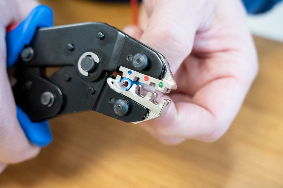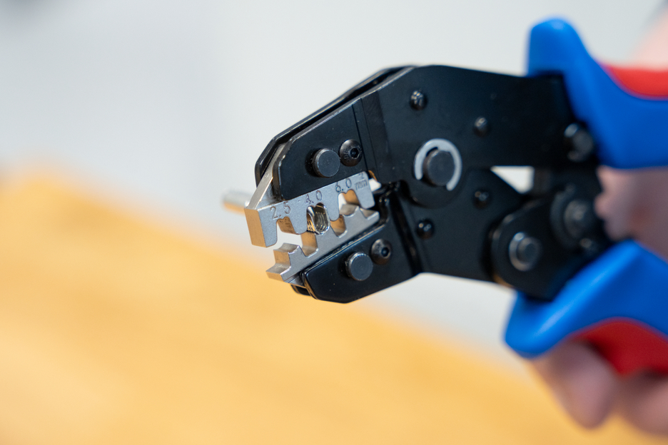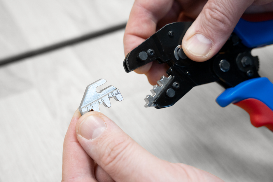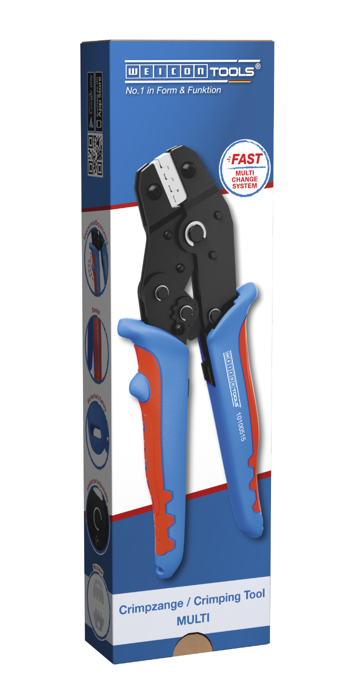 Die Crimpzange MULTI wurde für das prozesssichere Crimpen verschiedener elektrischer Steckverbinder entwickelt. Die Zange besitzt einen Ratschen-Mechanismus mit Zwangssperre für gleichbleibend hohe Crimpqualität und ein wiederholgenaues Arbeiten. Der Mechanismus öffnet die Zange erst dann, wenn der Crimpprozess vollständig abgeschlossen ist. Zusätzlich wurde eine Notentriegelung im Griff integriert, die die Zange im Fall einer Fehlanwendung wieder öffnet. Eine präzise Exentereinstellung sorgt durch die exakt justierbare Crimpkraft für eine hohe Crimpqualität. Mit dem Multi Change System lassen sich die Modulpaare der Zange bei Bedarf schnell und unkompliziert austauschen. Der werkzeuglose Wechselprozess sorgt für den schnellen Ein- und Ausbau der Module. In der Standardausführung ist die Crimpzange mit drei Modulpaaren aus hochwertigem Stahl ausgestattet. Ein Paar für MC4-Stecker mit Kabelquerschnitten von 2,5 mm², 4 mm² und 6 mm² (14-10 AWG). Ein weiteres Modulpaar für isolierte Aderendhülsen von 0,25-6 mm² (AWG 24-10) und ein drittes Modul für isolierte Kabelschuhe von 0,25-2,5mm² (AWG 24-14). Die drei Modulpaare werden in einer kleinen Plastikbox sicher und staubgeschützt aufbewahrt. Die 2-Komponenten-Griffe der Crimpzange MULTI sorgen für rutschfestes und ergonomisches Arbeiten bei maximaler Kraftübertragung. Dabei wurde das bewährten „Ice-Crack-Design“ verwendet, das für eine angenehme Haptik sorgt. Die integrierten Ösen an den Griffen dienen zur Befestigung einer Fallsicherung.