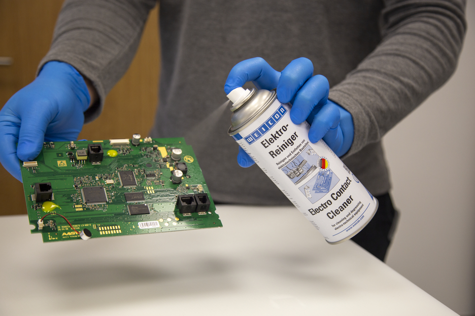 WEICON Elektroreiniger ist ein Spezialreiniger für die schnelle und effektive Reinigung und Entfettung von verschmutzten oder korrodierten Kontakten aller Art. Elektroreiniger wurde speziell für die Reinigung elektronischer und mechanischer Bauteile entwickelt. Die spezielle Formulierung mit hochreinen Lösemitteln entfernt Oxid-/ Sulfidschichten, Abbrandreste sowie harzige oder rußige Staubablagerungen. Es reduziert den Spannungsabfall und erhöht die elektrische Leitfähigkeit. Verschmutzungen, die Kriechströme verursachen können, werden entfernt. WEICON Elektroreiniger kann an elektrotechnischen oder mechanischen Bauteilen, wie Elektromaschinen, Messgeräten, Werkzeugen, Waagen, Schaltern und Sensoren oder elektrischen Steckverbindungen, Kontakten, Relais und Schaltanlagen zum Einsatz kommen.