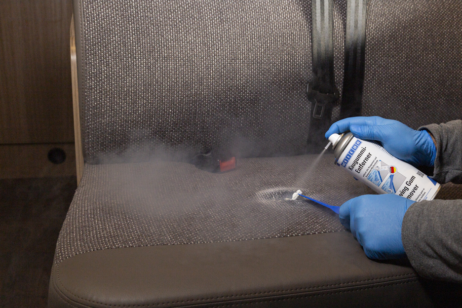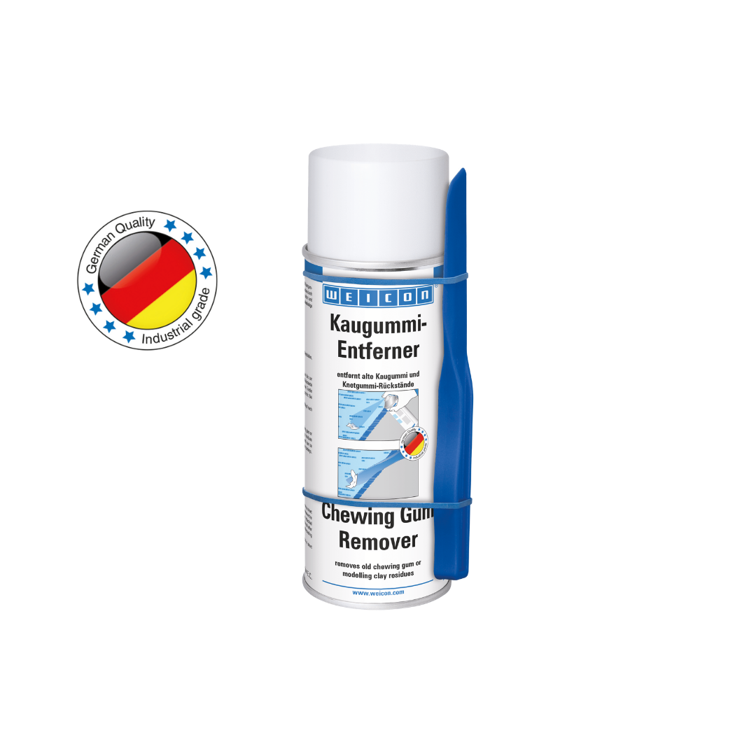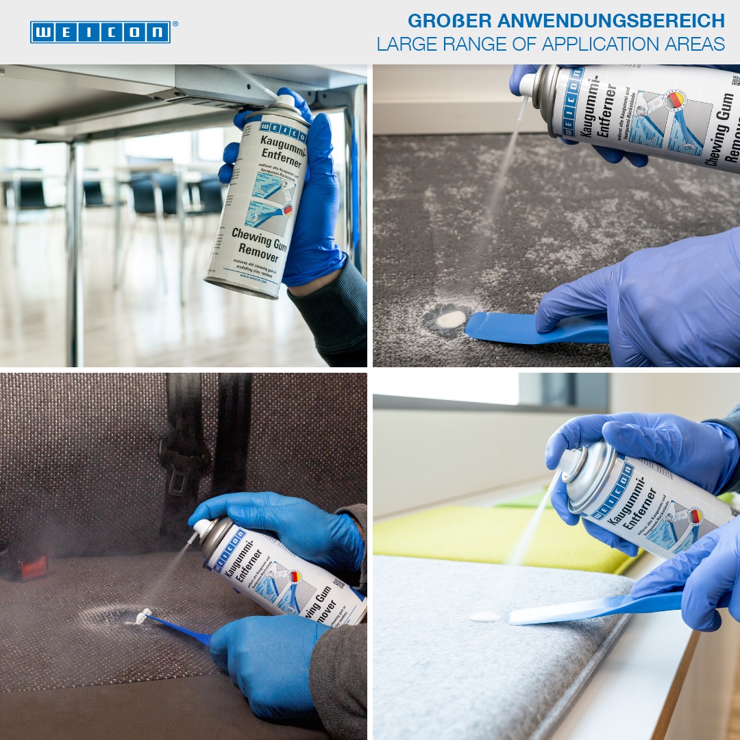 WEICON Chewing Gum Remover even removes old chewing gum and plasticine residues. The chewing gum and plasticine residues are frozen when sprayed with WEICON Chewing Gum Remover and can be detached immediately and without damaging textiles or floorings. WEICON Chewing Gum Remover removes chewing gum and plasticine residues from upholstered furniture, bus seats (rigid foam), school chairs and tables, textile floorings of all types and elastic and hard floor coverings such as wood and stone floors, PVC and linoleum flooring.