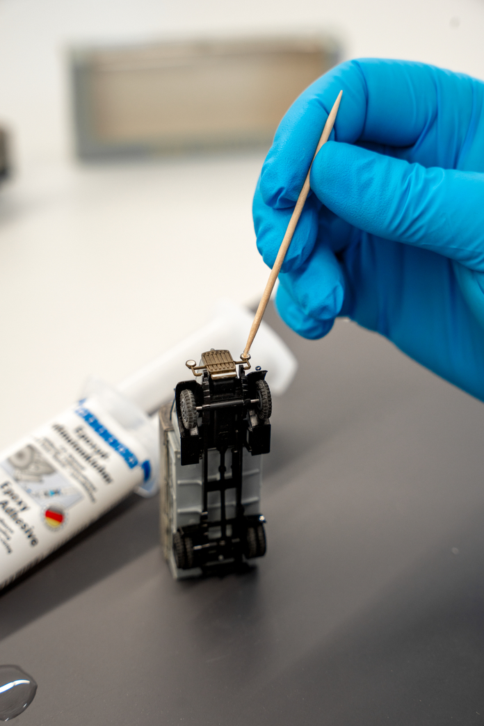 Der Epoxyd-Minutenkleber kann ohne Mischdüse verarbeitet werden. Dafür den Klebstoff einfach in einem Schälchen homogen vermischen.