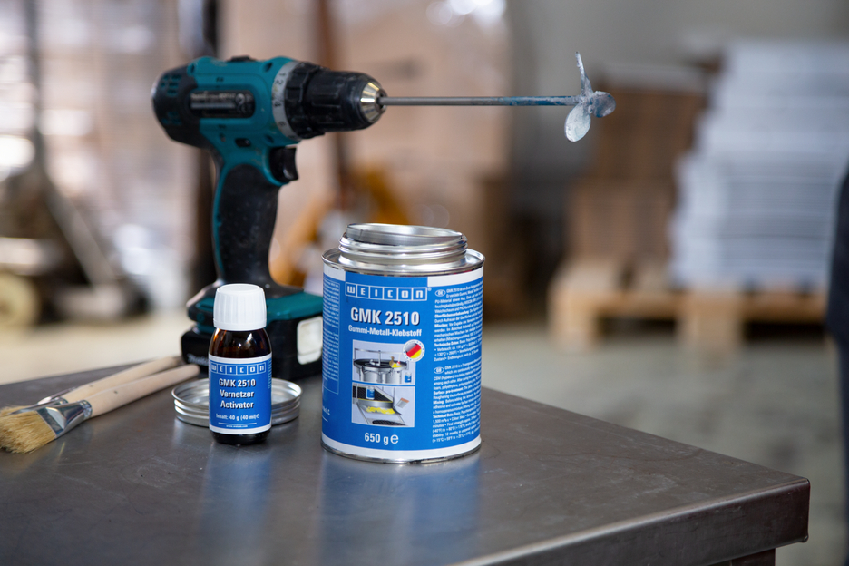 WEICON GMK 2510 ist ein 2-Komponenten-Klebstoff auf Polychloroprenbasis für vollflächige und dauerelastische Verklebungen, die dauerhaft dynamischen Belastungen ausgesetzt sind. Der Vorteil gegenüber 1-Komponenten-Kontaktklebstoffen liegt in der deutlich besseren Haftung und der verbesserten Temperaturbeständigkeit. GMK 2510 verklebt Gummi, Metall, Textilien, Leder, Moosgummi (Neopren), CSM (Hypalon), Dämmmaterialien, haftbeschichtetes PU-Material sowie Holz, Stein und viele Kunststoffe mit- und untereinander. Die Verbindungen sind nach der Aushärtung feuchtigkeitsbeständig. WEICON GMK 2510 ist für Werkstoffe wie z.B. Polystyrolschaum, Polyethylen, Polypropylenteile, PVC-Weichschaum und PVC-Kunstleder nicht geeignet.