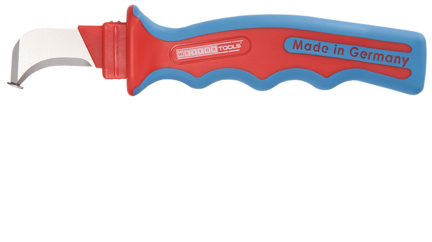 Arbeiten unter Spannung bis 1000 Volt | Schutz der Leiter durch schuhförmige Klingenspitze | gute Kraftübertragung durch optimierte Griffform | schnelles aufschneiden mehrfach isolierter Kabel I Klinge aus Kohlenstoffstahl somit leichter zu schärfen I Gleitschuh an der Klingenspitze geschweißt