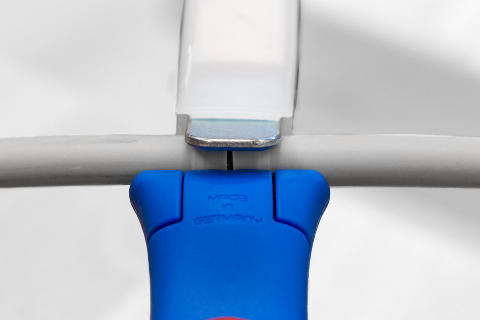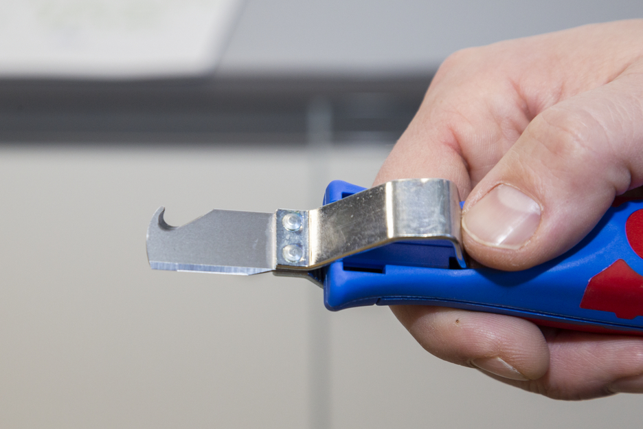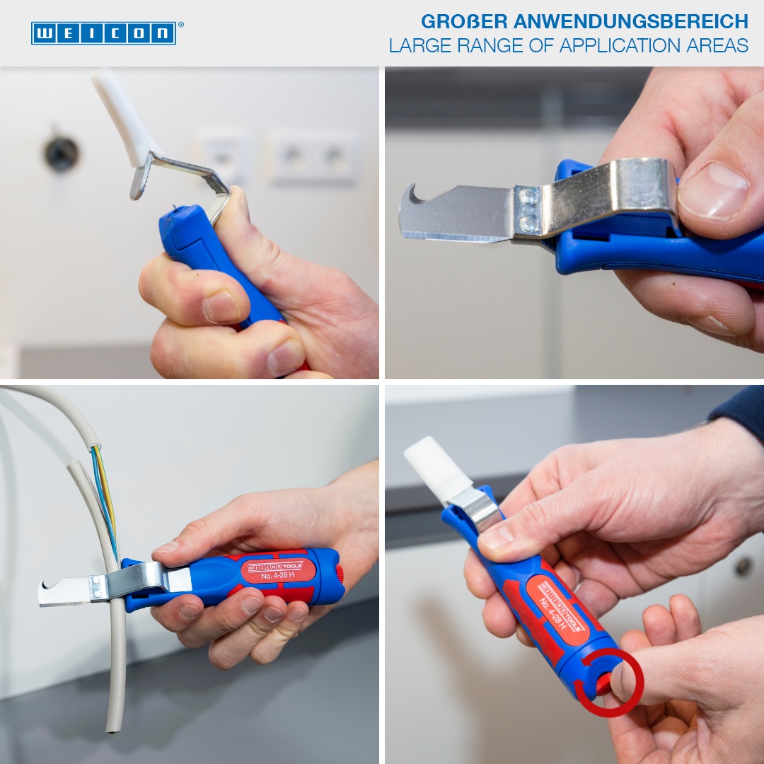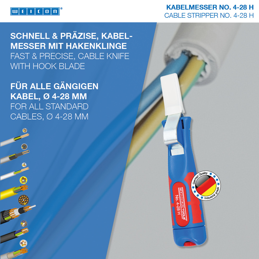 Das Kabelmesser 4-28 H ermöglicht ein präzises, schnelles und sicheres Abmanteln aller gängigen Rundkabel mit einem Durchmesser zwischen 4 und 28 Millimeter. Das Kabelmesser verfügt über einen ergonomisch geformten, rutschfesten Mehrkomponenten-Griff. Mit Hilfe einer Stellschraube am Griffende kann die Schnitttiefe des Schneidmessers stufenlos reguliert werden. Dies verhindert eine Beschädigung der inneren Leiter. Das Schneidmesser ist selbstdrehend im Gehäuse integriert und ermöglicht so die automatische Umstellung von Rund- auf Längsschnitt. Zusätzlich verfügt das 4-28 H über eine Hakenklinge, die mit einer Schutzkappe versehen werden kann. Diese Kappe rastet sicher auf der Klinge ein, was die Verletzungsgefahr deutlich reduziert.