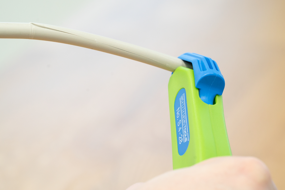 Die WEICON TOOLS Green Line ist eine ganz besondere Produktlinie, die speziell auf Nachhaltigkeit und Schonung der Ressourcen ausgerichtet ist. Die Green Line umfasst Abisolierwerkzeuge, die aus bis zu 97 % nachwachsenden und natürlichen Rohstoffen bestehen. Das Kabelmesser S 4-28 ermöglicht ein präzises, schnelles und sicheres Abmanteln aller gängigen Rundkabel mit einem Durchmesser zwischen 4 und 28 Millimeter. Mit Hilfe eines Stellrades im Gehäuse kann die Schnitttiefe des Schneidmessers stufenlos reguliert werden. Dies verhindert eine Beschädigung der inneren Leiter. Das Schneidmesser ist selbstdrehend im Gehäuse integriert und ermöglicht so die automatische Umstellung von Rund- auf Längsschnitt. Zusätzlich wurde eine Hakenklinge in das S 4-28 integriert, die im Gehäuse versenkt werden kann. In beiden Positionen ist die Klinge arretierbar. Das führt zu einer deutlichen Reduktion des Verletzungsrisikos, das feststehende Klingen mit sich bringen.