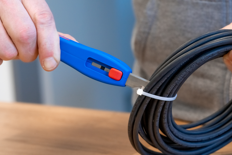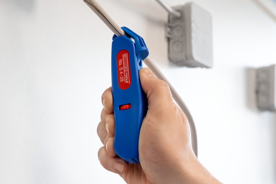 Das Kabelmesser S 4-28 ermöglicht ein präzises, schnelles und sicheres Abmanteln aller gängigen Rundkabel mit einem Durchmesser zwischen 4 und 28 Millimeter. Mit Hilfe eines Stellrades im Gehäuse kann die Schnitttiefe des Schneidmessers stufenlos reguliert werden. Dies verhindert eine Beschädigung der inneren Leiter. Das Schneidmesser ist selbstdrehend im Gehäuse integriert und ermöglicht so die automatische Umstellung von Rund- auf Längsschnitt. Zusätzlich wurde eine Hakenklinge in das S 4-28 integriert, die im Gehäuse versenkt werden kann. In beiden Positionen ist die Klinge arretierbar. Das führt zu einer deutlichen Reduktion des Verletzungsrisikos, das feststehende Klingen mit sich bringen.