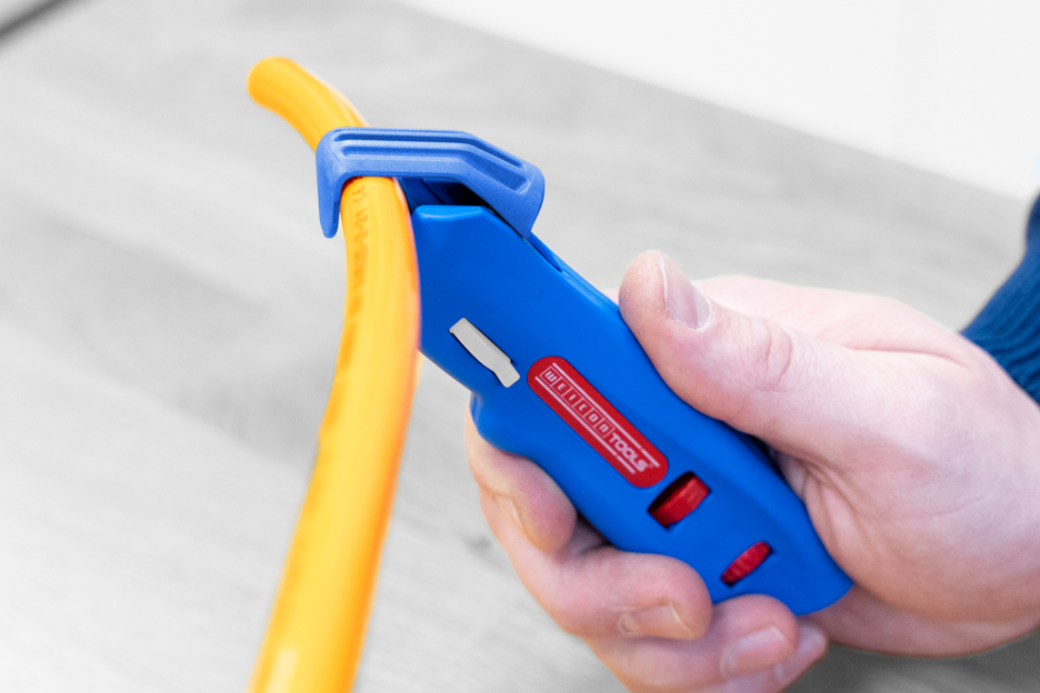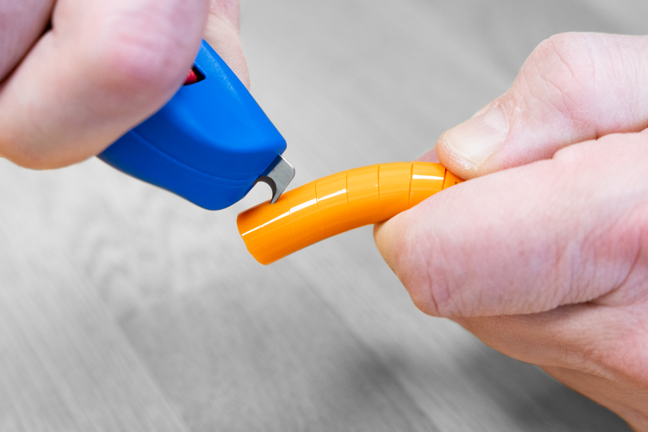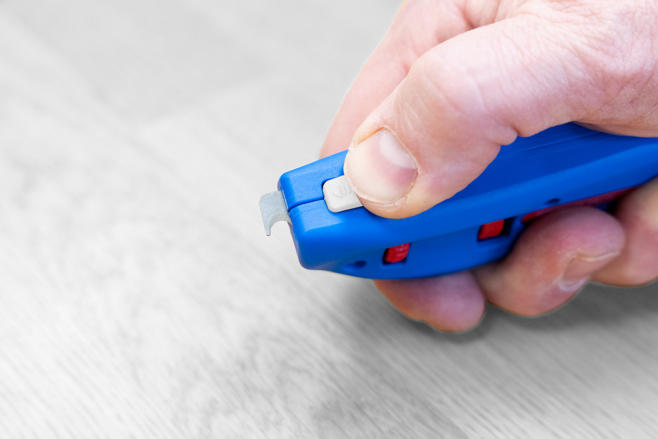 Das Kabelmesser No. S 4-28 Spiral ermöglicht ein präzises, schnelles und sicheres Abmanteln aller gängigen Rundkabel mit einem Durchmesser zwischen 4 und 28 Millimetern. Für Kabel, die sich nicht einfach per Rund- und Längsschnitt entmanteln lassen, hat das Werkzeug eine Zusatzfunktion – einen Spiralschnitt, mit dem es möglich ist, anspruchsvolle Isolierungen leicht zu entfernen. Mit dem drehbaren Innenmesser können Rund-, Längs- und Spiralschnitte sowohl an weichen als auch an harten Kabelisolierungen durchgeführt werden. Die Schnitttiefe ist komfortabel per arretierbarem Stellrad in 0,1 mm-Schritten von 0-3 Millimeter präzise einstellbar, dadurch wird eine Beschädigung tiefer liegender Schichten vermieden. Das Schneidmesser ist selbstdrehend im Gehäuse integriert und ermöglicht so eine schnelle automatische Umstellung von Rund- auf Längsschnitt – nur bei der Anwendung Spiralschnitt muss die Klinge arretiert werden. Um einen Spiralschnitt auszuführen, wird mit Hilfe eines Stellrades in die jeweilige Funktion vom Rund- zum Spiralschnitt gewechselt. Anschließend noch mit dem Umlegen des Spiralschalters die innenliegende Klinge arretiert und schon schneidet das Kabelmesser im Spiralschnitt. Um zurück zum Rundschnitt zu wechseln, muss die Arretierung mit dem Spiralschalter gelöst werden, das Messer bewegt sich dann wieder frei und man kann in gewohnter Weise den Rundschnitt durchführen. Nach dem Spiralschnitt empfiehlt es sich, die Isolation am Ende kurz einzuschneiden, damit sie sich leichter abschälen lässt. Für diesen Arbeitsgang ist das Werkzeug mit einer versenkbaren Hakenklinge ausgestattet. Über einen Schieber wird das selbsteinziehende Sicherheitsmesser betätigt und bei einer möglichen Fehlanwendung automatisch zurückgezogen, um Schnittverletzungen zu vermeiden. So wird die Verwendung der Klinge deutlich sicherer im Vergleich zu fest arretierten Klingen, wie beispielsweise bei Cuttermessern.