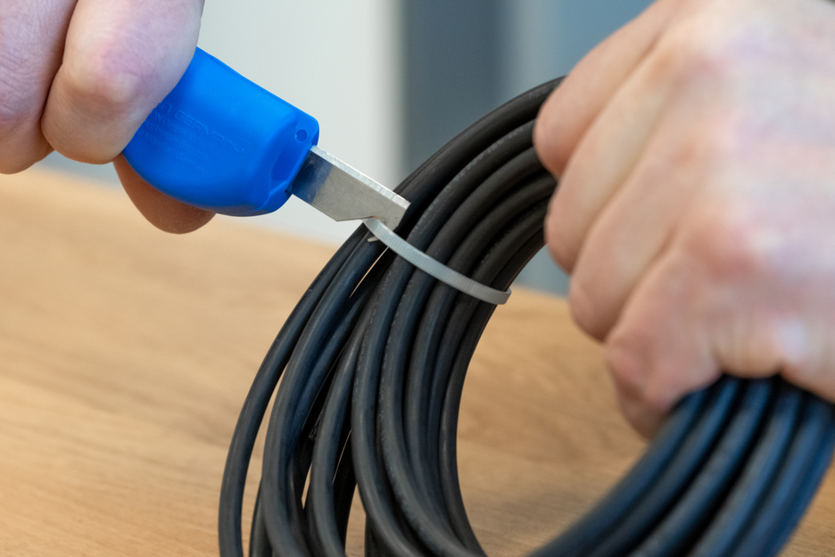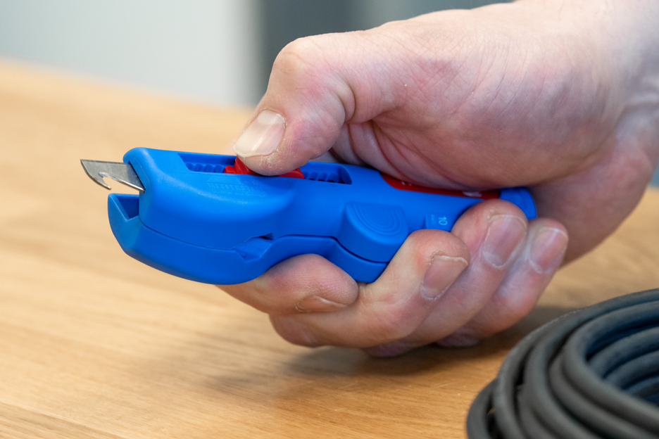 Multifunktionell mit optimierter Kabelführung | Rundschnitt – Längsschnitt – Abisolieren – Schneiden | wechselbare Hakenklinge in jeder Position arretierbar