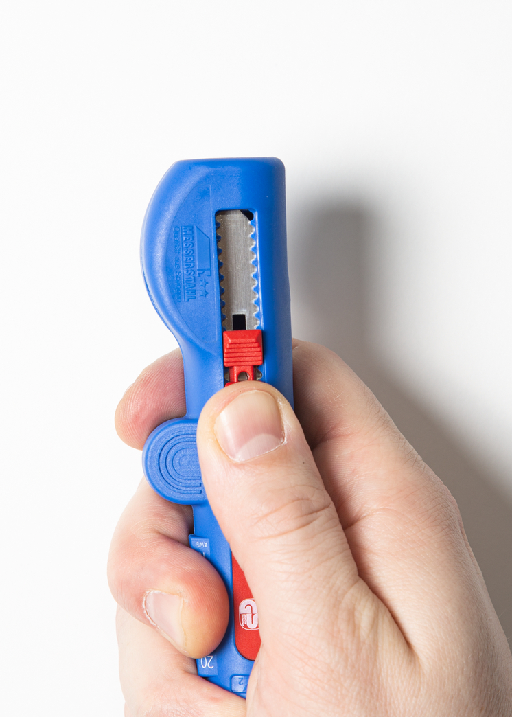 Der Quadro-Entmanteler No. 16 ist ein neu entwickeltes Werkzeug für den professionellen Anwender in Industrie und Handwerk. Das 4-in-1-Werkzeug erfüllt mehrere Funktionen: Rundschnitt – Längsschnitt – Abisolieren – Schneiden. So können mehrere Werkzeuge durch ein einziges ersetzt werden. Das spart Geld und Platz im Werkzeugkoffer. Die optimal integrierte Kabelführung im Gehäuse sorgt für ein sicheres, präzises und komfortables Abmanteln aller gängigen Rund- und Feuchtraumkabel mit einem Durchmesser von 8,0 - 13,0 mm. (z.B. NYM-Kabel 3 x 1,5 mm² bis 5 x 2,5 mm). Durch die ergonomische Griffform ist das Werkzeug besonders gut in der Handhabung. Der ausgeprägte Griff bewirkt, dass der Quadro-Entmanteler No. 16 gut und sicher in der Hand liegt und man nicht abrutscht. Das erleichtert die tägliche Arbeit und erhöht zudem die Sicherheit. Auch an schwerzugänglichen Stellen oder in Abzweig- und Verteilerdosen können Kabel mit dem Werkzeug bündig abgemantelt und abisoliert werden. Die Schnitttiefe muss nicht extra manuell reguliert werden. Alle gängigen flexiblen und massiven Leiter mit einem Querschnitt von 0,5 - 6 mm² können im integrierten Abisolierbereich bearbeitet werden. Das Universalwerkzeug besitzt eine versenkbare Hakenklinge, die in jeder Position fest arretierbar und leicht zu wechseln ist.