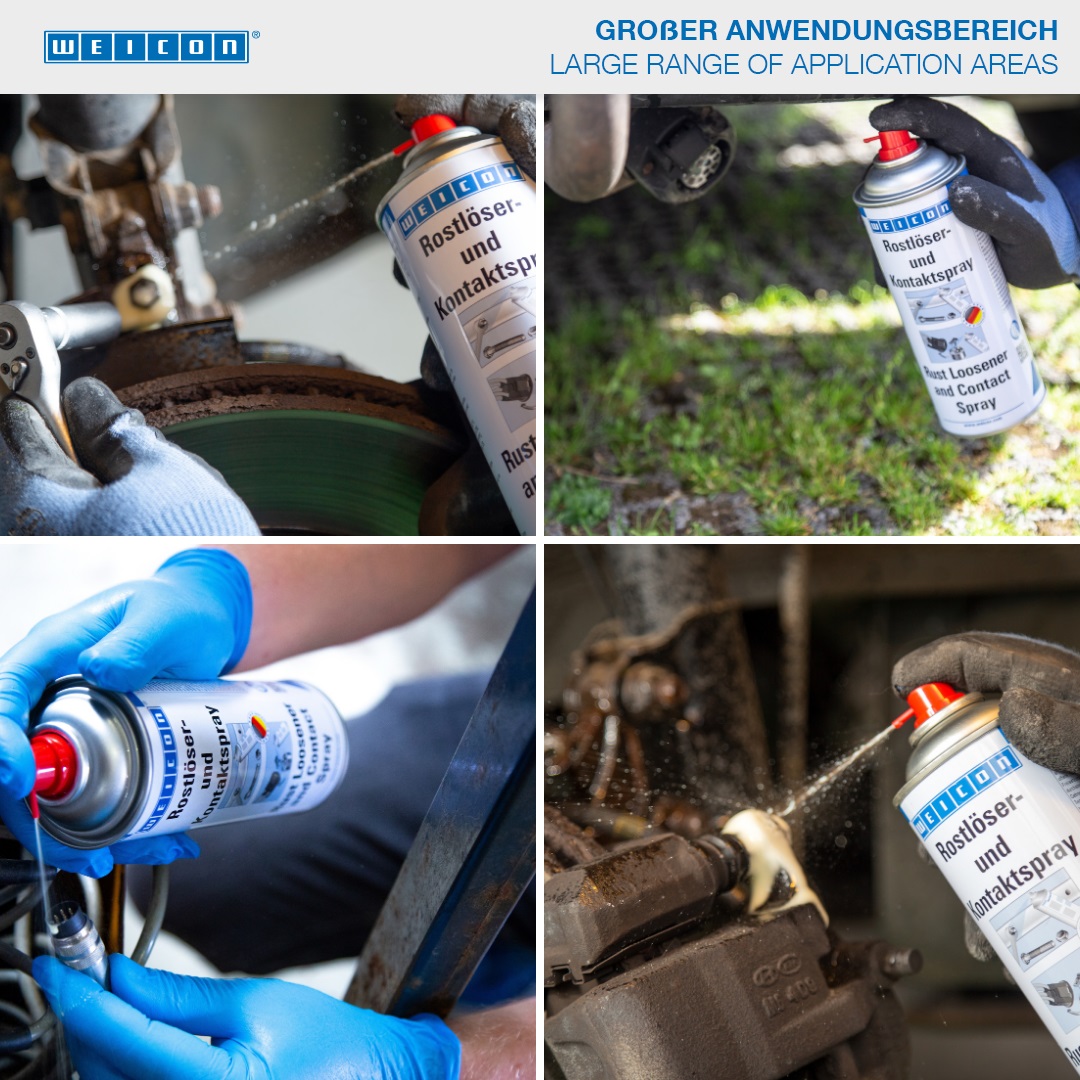 WEICON Rostlöser- und Kontaktspray ist durch seine 6-fach-Wirkung unentbehrlich bei Reparatur, Instandhaltung und Wartung. Durch die sehr guten Kriecheigenschaften dringt Rostlöser- und Kontaktspray auch in kleinste Zwischenräume. Mit dem 3-Wege Sprühventil sind Arbeiten in jeder Lage möglich (auch über Kopf). WEICON Rostlöser- und Kontaktspray löst festgerostete und schwergängige Bauteile, Verschraubungen, Bolzen, Gelenke und Scharniere, verdrängt Wasser von Zündanlagen, sichert die Funktion von mechanischen Teilen und Kontakten z.B. an Verteilerkappen und Zündkerzensteckern, schützt nachhaltig vor Korrosion und Oxidation, schmiert langanhaltend Gleitflächen und pflegt und säubert Metalloberflächen, mechanische Teile und elektrische Anlagen.
