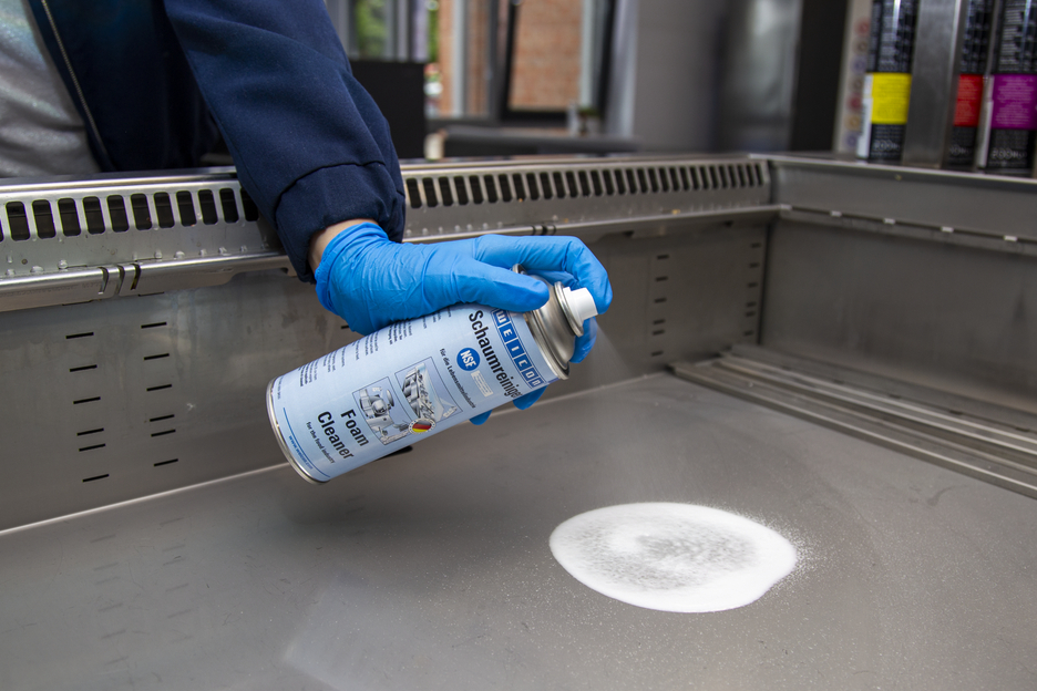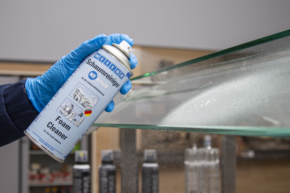 WEICON Schaumreiniger ist universell einsetzbar und kann zur Reinigung und Entfettung wasserbeständiger Oberflächen und zum Entfernen von Verunreinigungen auf Kunststoff,- Glas- und Textiloberflächen eingesetzt werden. Aufgrund der NSF A1-Registrierung eignet sich der Schaumreiniger zum Einsatz in sensiblen Bereichen, wie der Lebensmittel- und Getränkeindustrie sowie in der pharmazeutischen und kosmetischen Industrie. Das Spray eignet sich zur Reinigung von Transportbändern, die in Kontakt mit Lebensmitteln kommen, wie in der Produktion oder im Einzelhandel. Es entfernt Verschmutzungen an Maschinengehäusen und reinigt Waagen, Flat Screens, Touchscreens, Navigationssysteme und vieles mehr. Der Schaumreiniger beseitigt verschiedenste Verunreinigungen, wie Öle und Fette, Fingerabdrücke, Ruß, Nikotin, Staub sowie Rückstände von Insekten. Er kann überall dort verwendet werden, wo säurehaltige oder alkalische Reinigungsmittel nicht eingesetzt werden dürfen.