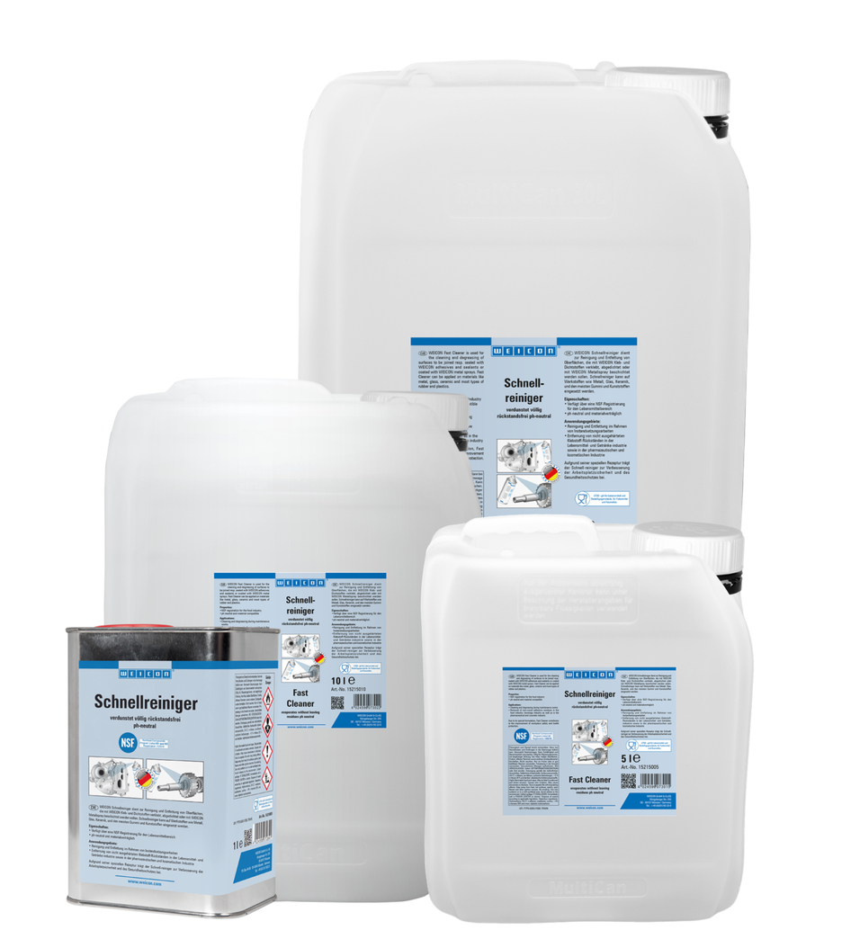Der Schnellreiniger verfügt über eine NSF Registrierung für den Lebensmittelbereich und kann somit als Reiniger und Entfetter zur Schmutzentfernung im Rahmen von Instandsetzungsarbeiten sowie zur Entfernung von Klebstoffen in der Lebensmittelindustrie, in der Nahrungsmittel- und Getränkeindustrie sowie der pharmazeutischen und kosmetischen Industrie eingesetzt werden. Schnellreiniger wird zum Reinigen und Entfetten von Oberflächen verwendet, die mit WEICON Kleb- und Dichtstoffen verklebt bzw. abgedichtet oder mit WEICON Metallsprays beschichtet werden sollen. Schnellreiniger ist pH-neutral und materialverträglich und kann auf vielen Werkstoffen, wie z.B. Metallen und Glas, Keramik und den meisten Gummi und Kunststoffen eingesetzt werden. Aufgrund seiner speziellen Rezeptur und der daraus resultierenden NSF Registrierung, kann der Schnellreiniger zur Verbesserung der Arbeitsplatzsicherheit und des Gesundheitsschutzes beitragen.