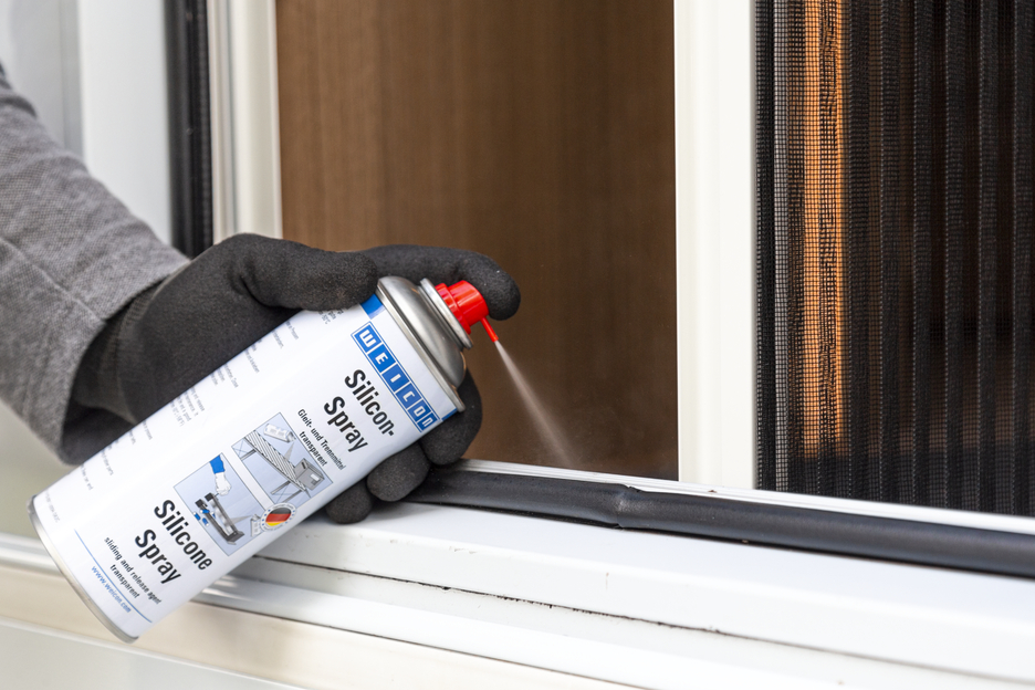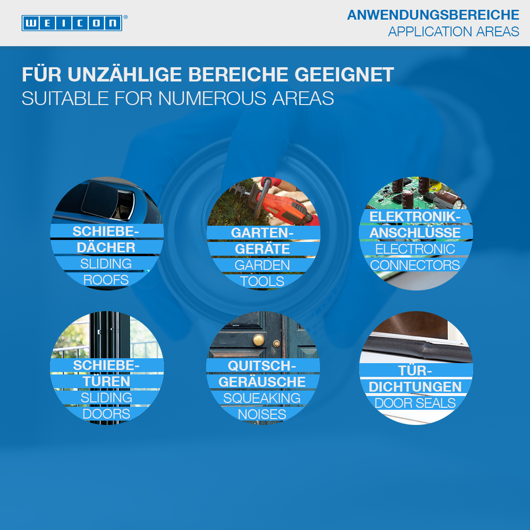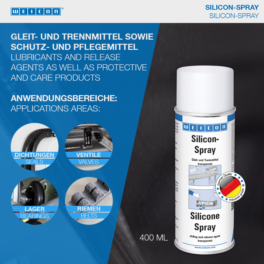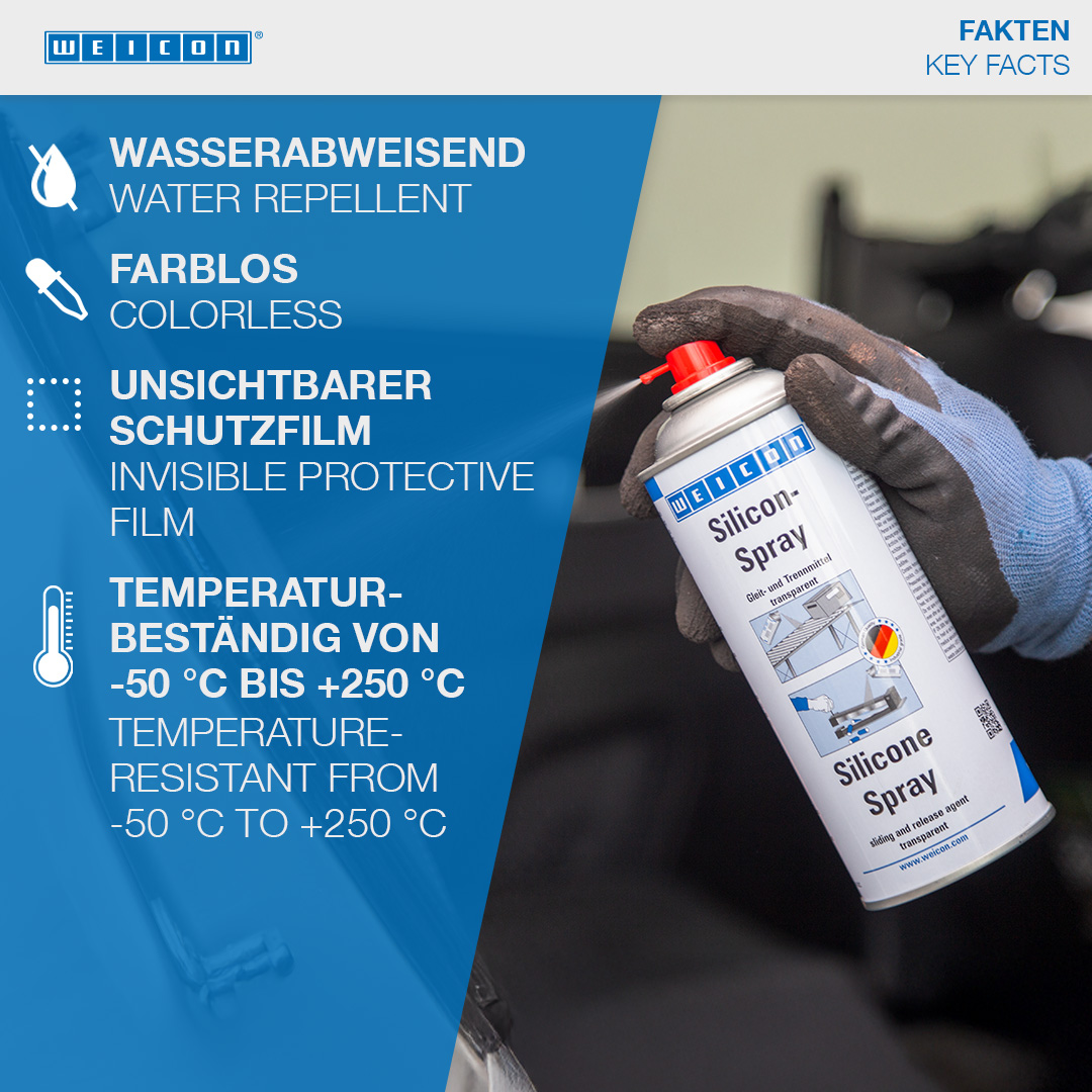 WEICON Silicon-Spray ist ein Gleit- und Trennmittel sowie ein Schutz- und Pflegemittel für Kunststoff, Gummi und Metall. Das Spray sorgt für einen langlebigen Trennfilm und eine gute Oberflächenbeschaffenheit und ist temperaturbeständig bis +250 °C (+482 °F). Silicon-Spray verhindert das Anhaften von Klebstoffen an Pressen und Führungen, das Anhaften von Gütern an Förderbändern, Rinnen und Gleitbahnen, schützt Elektrokontakte vor Feuchtigkeit, pflegt Gummi-, Kunststoff- und Metallteile, schützt Gummiteile vor Verspröden, Anfrieren und Ankleben und lässt Schiebedach- und Sitzschienen und Rollen von Sicherheitsgurten leichtgängig laufen.