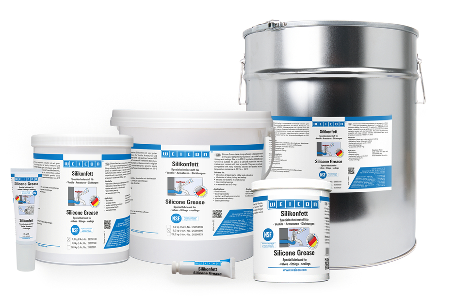 WEICON Silikonfett ist haftstark und transparent und hat eine sehr gute Kunststoffverträglichkeit. Aufgrund der NSF H1-Registrierung eignet es sich als Schmierstoff für Ventile, Armaturen und Dichtungen in sensiblen Bereichen. Das Fett entspricht den KTW-Leitlinien des Umweltbundesamtes für den Kontakt mit Trinkwasser. Es kann in der Lebensmitteltechnik, in der Getränkeindustrie, im Sanitär- und Heizungsbereich, in der Pharmaindustrie und in der Dichtungstechnik zum Einsatz kommen. WEICON Silikonfett ist BAM geprüft und sicherheitstechnisch beurteilt - siehe Merkblatt M 034-1 "Liste der nichtmetallischen Materialien für den Einsatz in Sauerstoff" (DGUV Information 213-075) der BG RCI. Das Fett ist besonders materialverträglich, geruchs- sowie geschmacksneutral und hat eine Temperaturbeständigkeit von -50 °C bis +200 °C. WEICON Silikonfett eignet sich für das Schmieren von Kunststoffteilen, Gummiteilen und -abdichtungen, das Schmieren von Ventilen, Armaturen und Dichtungen, für Geräte und Anlagen und als Montagehilfe für O-Ringe.