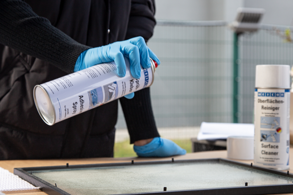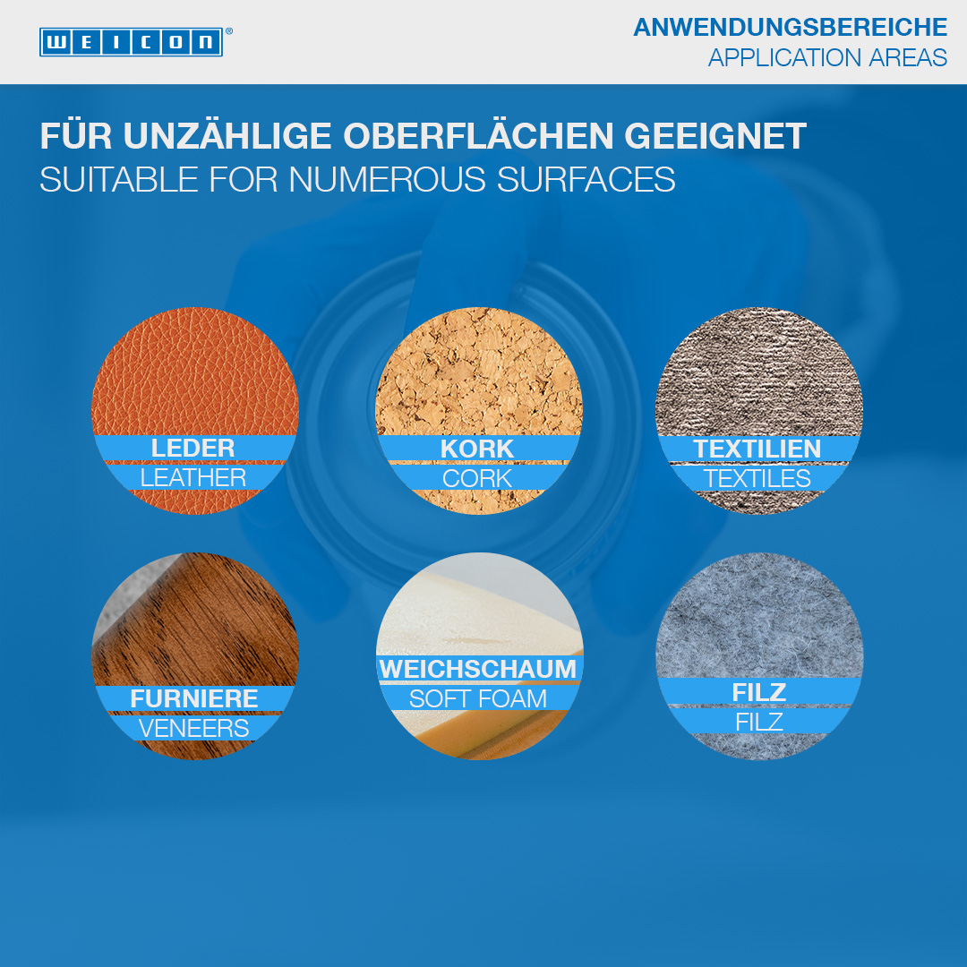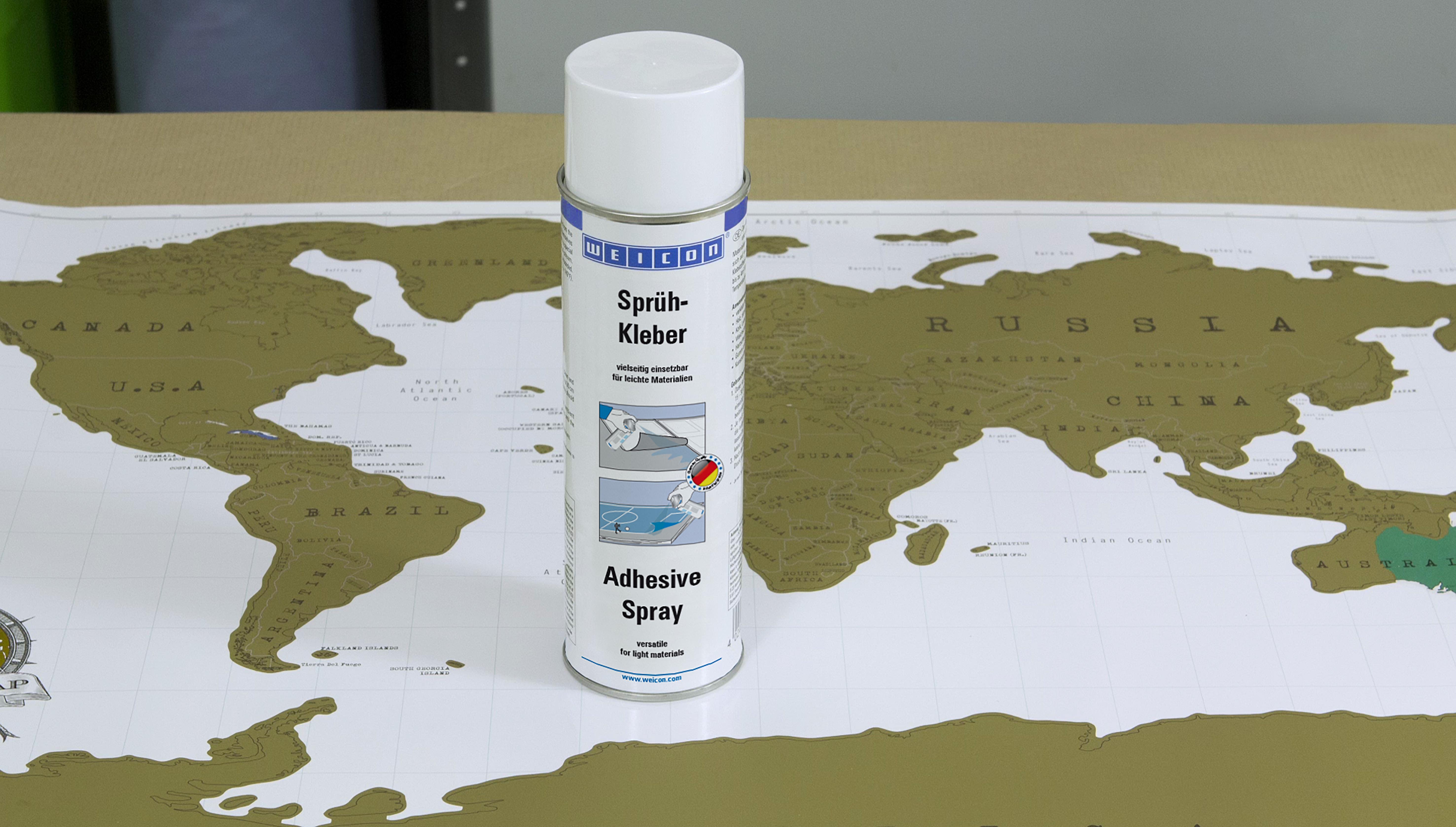WEICON Sprühkleber ist universell einsetzbar und verbindet leichte Materialien mit- und untereinander. WEICON Sprühkleber eignet sich zur Verklebungen zahlreicher Werkstoffe, wie Papier, Karton, Pappe, Holz, dünne Furniere, Kork, Leder, Textilien, Filz, Weichschaum, Gummi und Schaumgummi, Kunststofffolie (außer PVC und Polyethylen) und ist besonders für die Verklebung von Hartschaum geeignet.